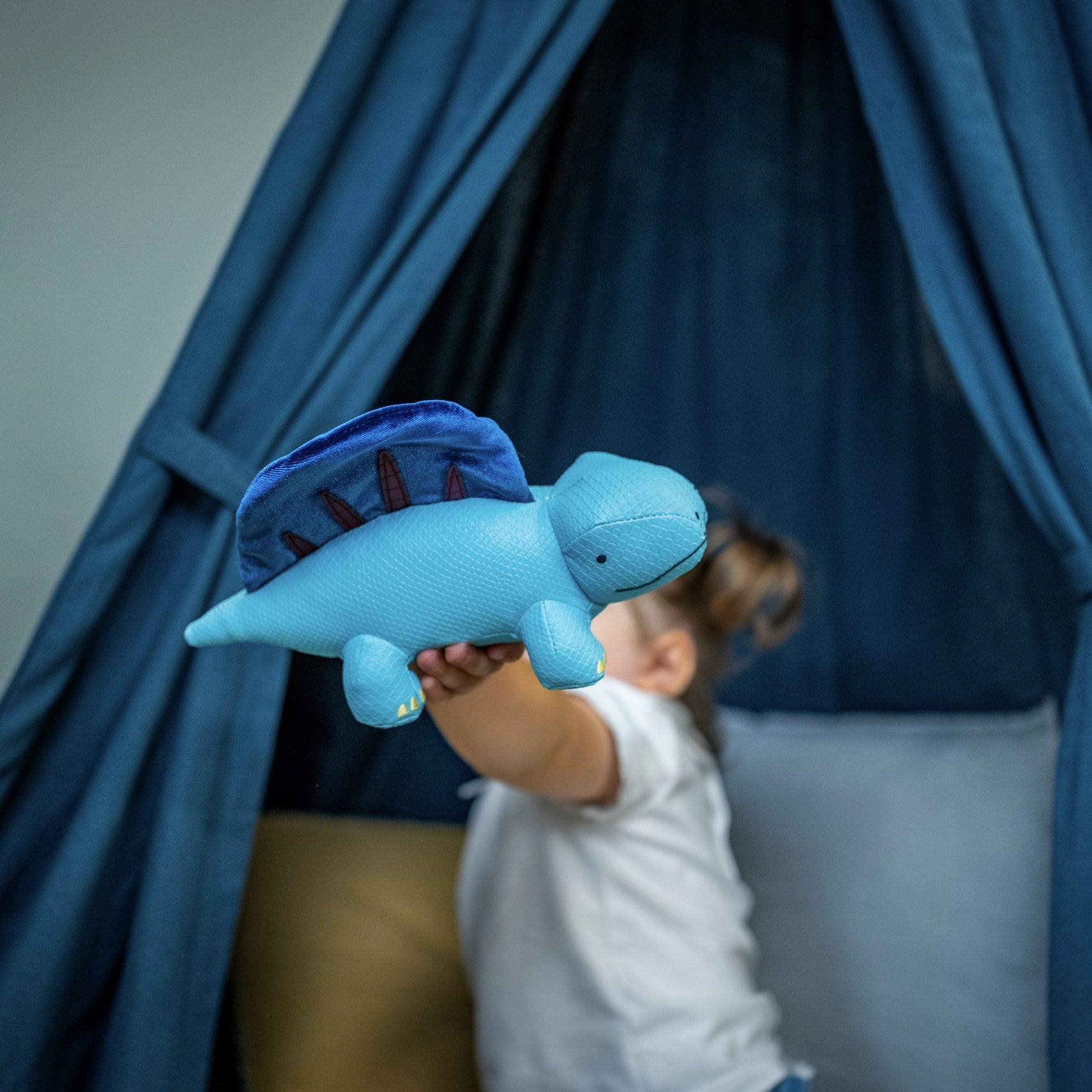 El material texturizado de su cuerpo azul y su vientre liso, y el crujiente tejido azul oscuro de su cresta despertarán la curiosidad de los pequeños exploradores.
