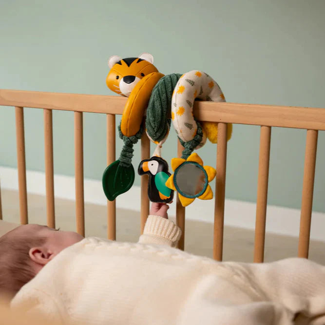 Desarrolla la motricidad y los sentidos del bebé con sus texturas, colores contrastados y juguetes de actividad: un animal para atrapar, un espejo o un mordedor.
