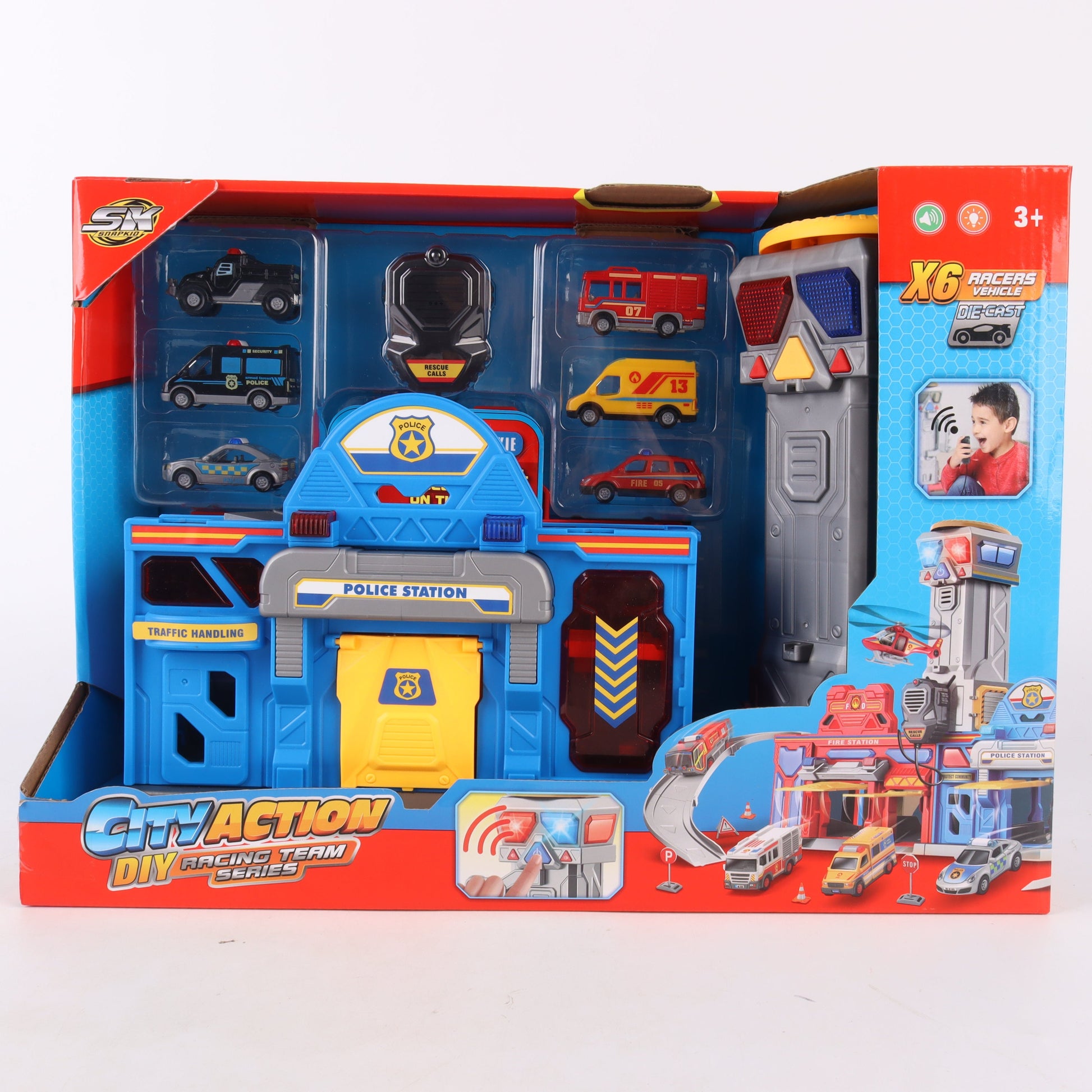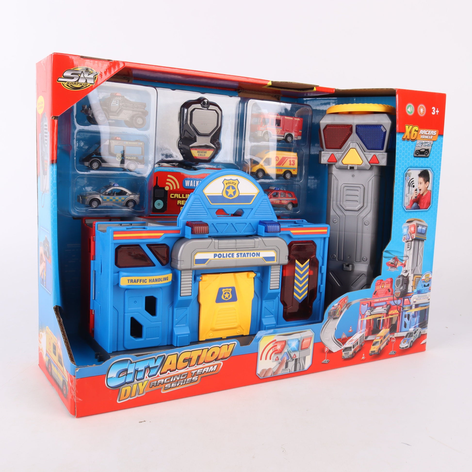 Este completo set incluye una estación de policía y bomberos de 29,5 pulgadas, pista de acción, 2 camiones de bomberos, 2 autos de policía, 1 helicóptero de rescate y señales de tráfico, brindando todo lo necesario para recrear auténticas aventuras de emergencia.