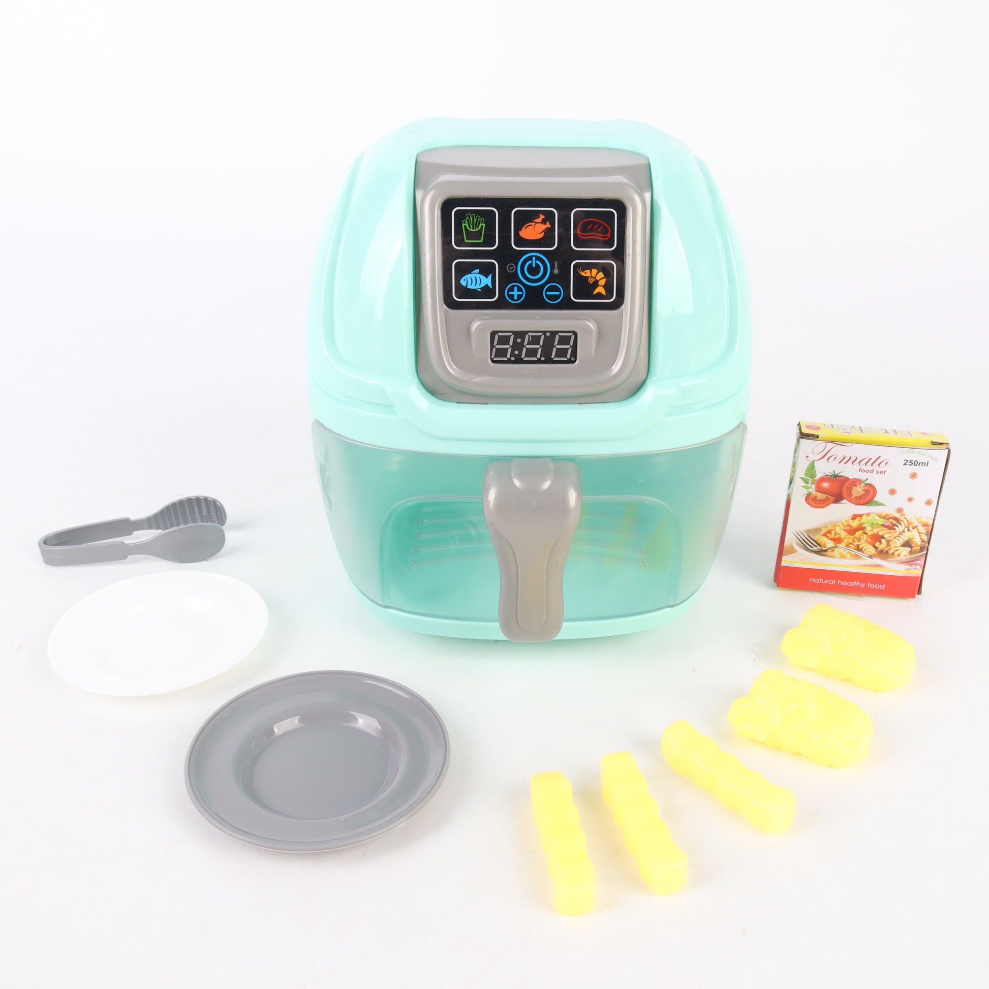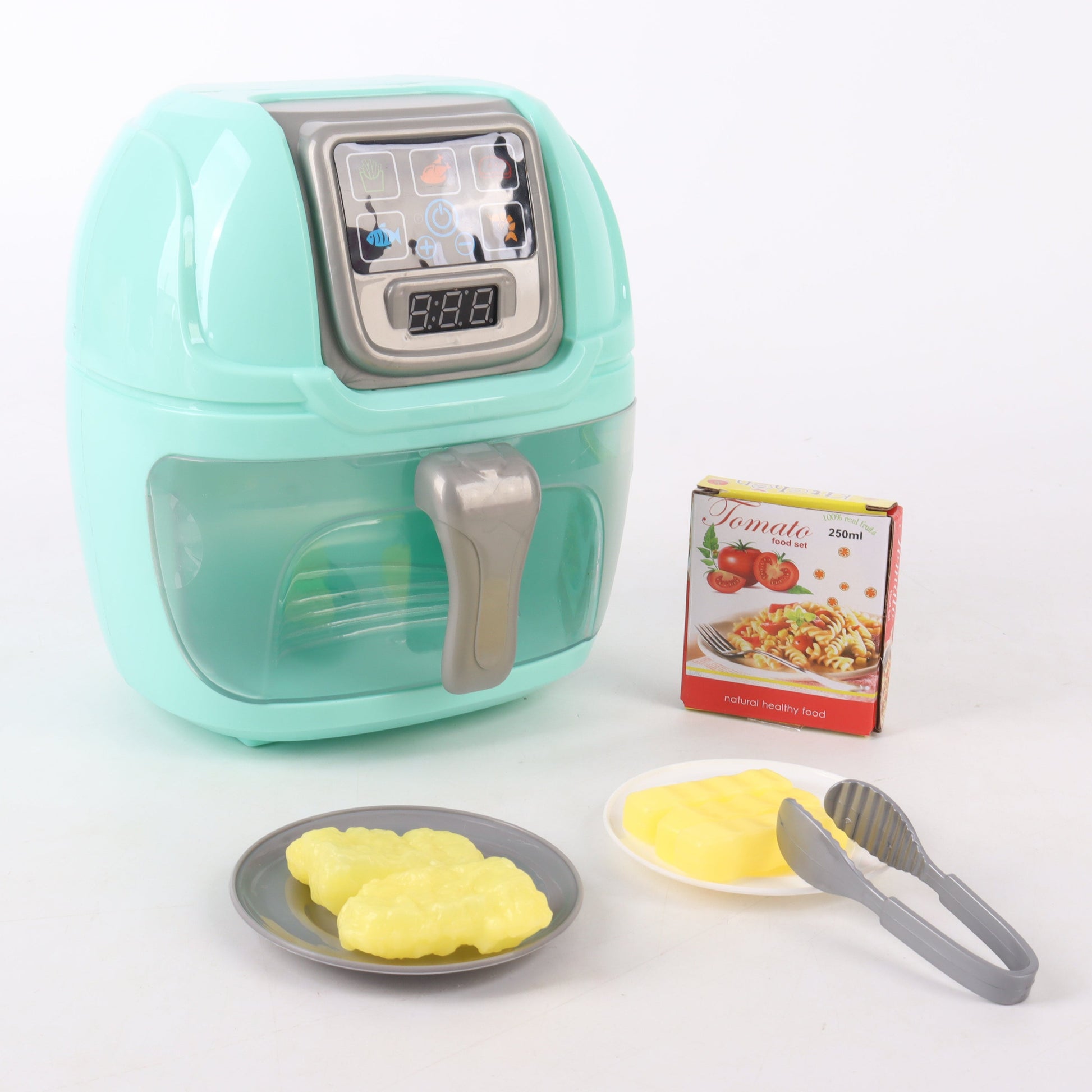 Simula una freidora de aire auténtica, con efectos de luz y sonido que imitan el proceso de cocción y un temporizador que hace la experiencia aún más real.