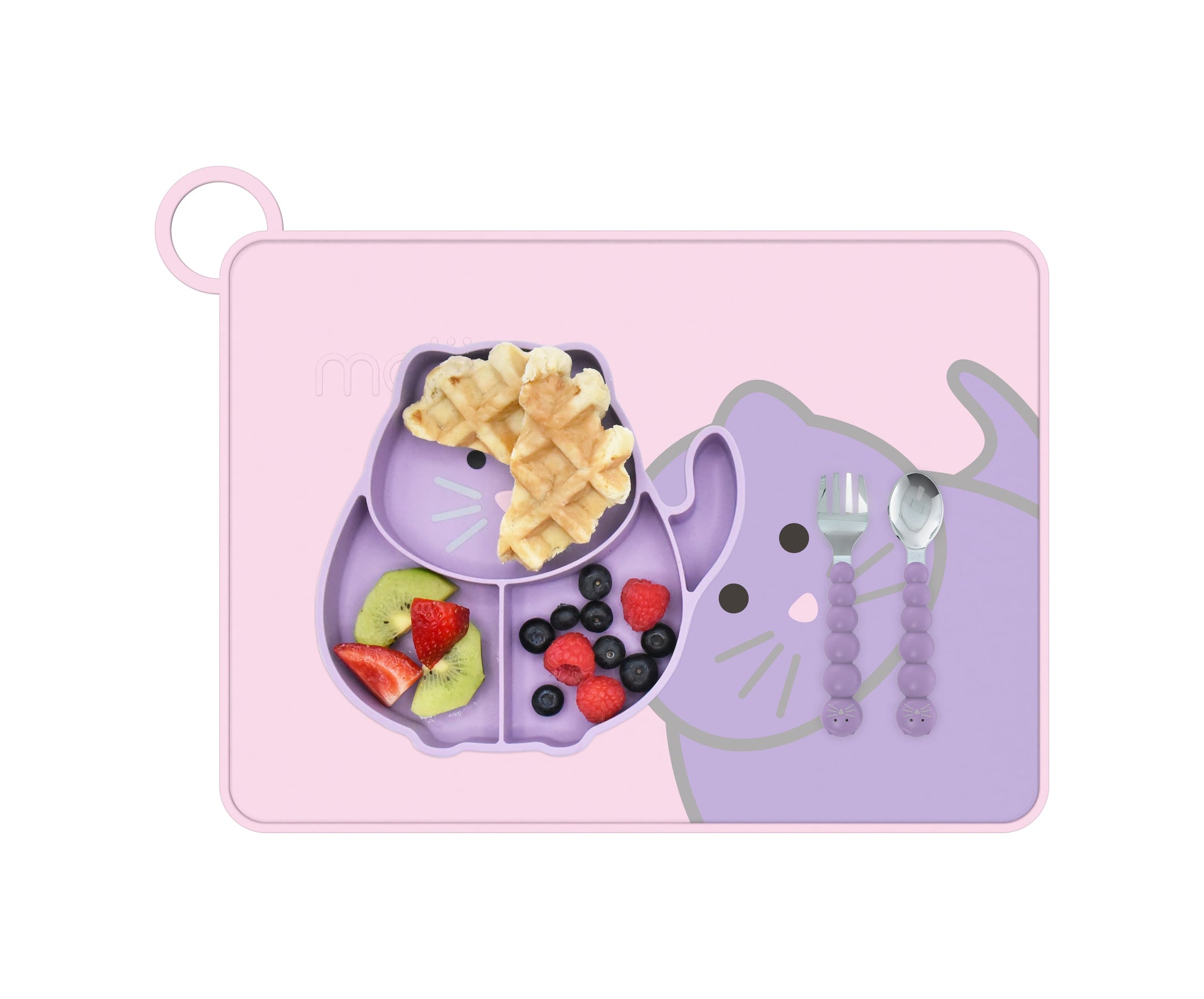 El Individual 100% de silicona de grado alimenticio viene con borde elevado y un bucle integrado para mantenerlo doblado y en orden.