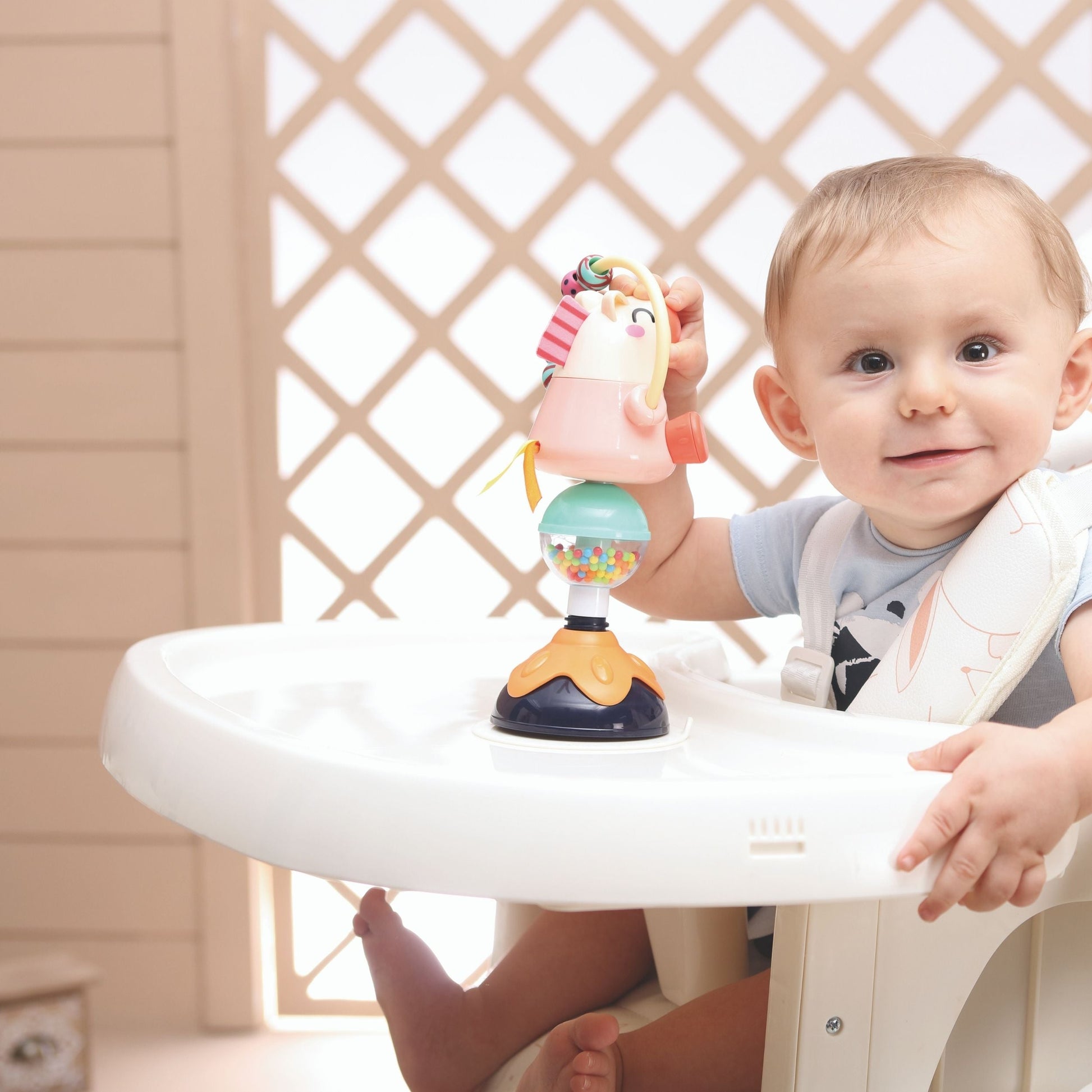 El juguete tiene una ventosa que permite sujetarlo a la mayoría de las superficies planas, incluidas sillas de bebé o mesas. >