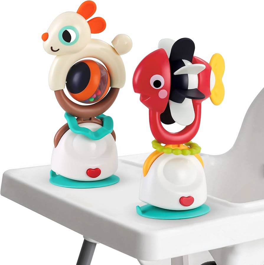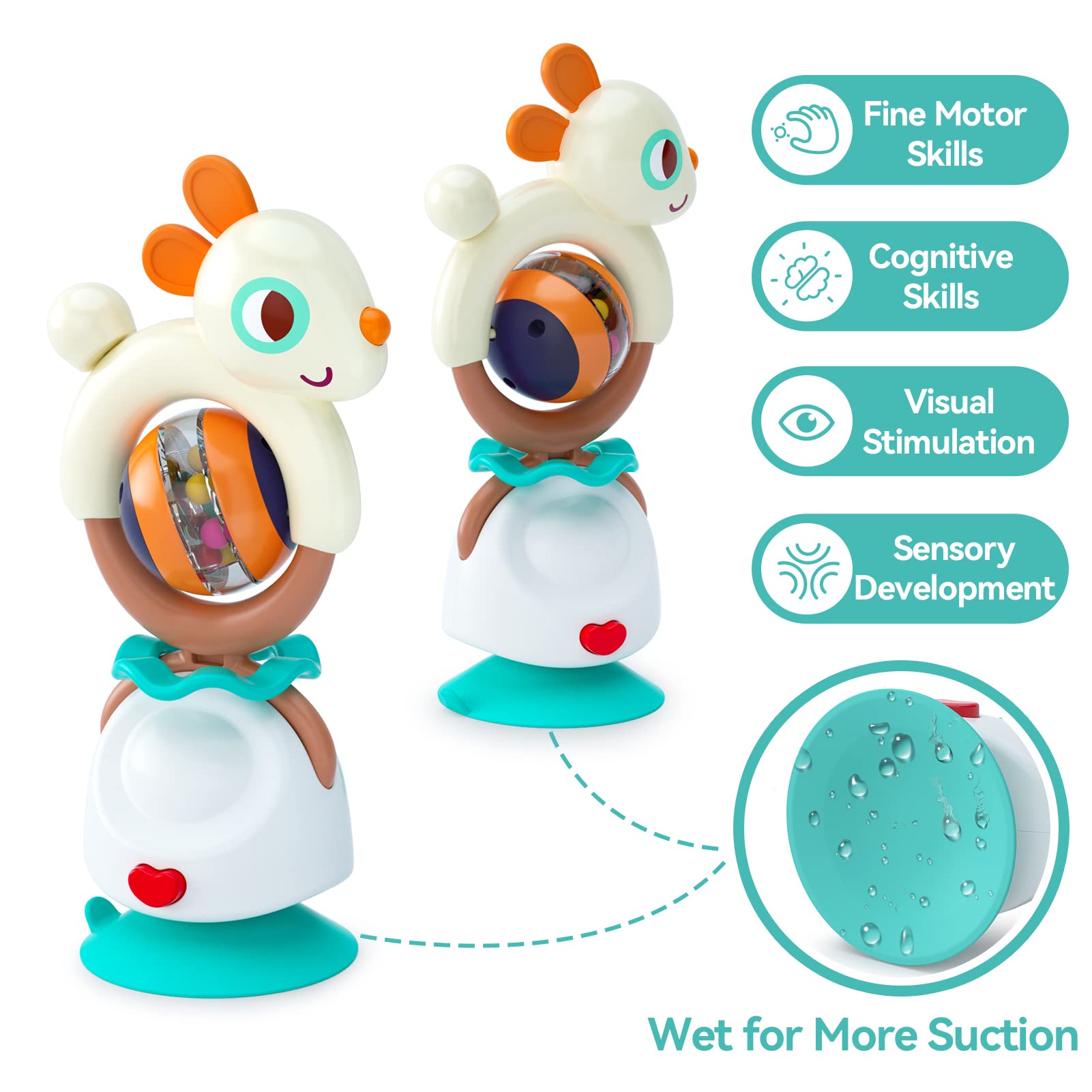 Los juguetes cuentan con una ventosa que permite sujetarlos a la mayoría de las superficies planas, incluidas sillas de bebé o mesas. >