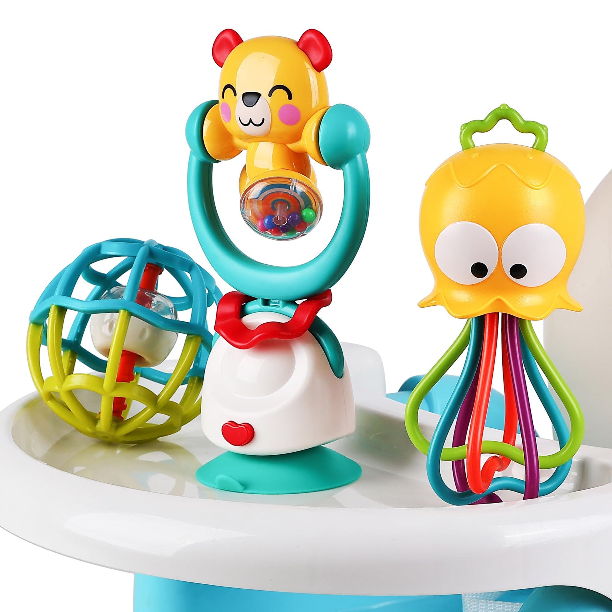 Los juguetes cuentan con una ventosa que permite sujetarlos a la mayoría de las superficies planas, incluidas sillas de bebé o mesas. >