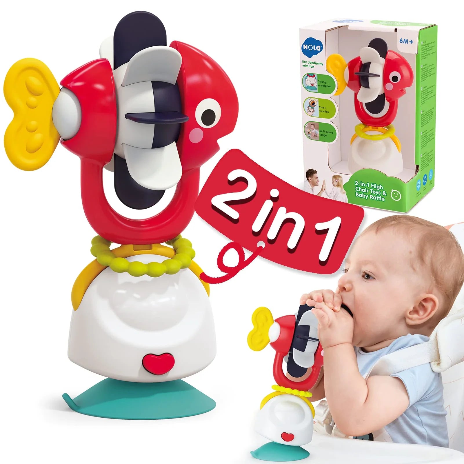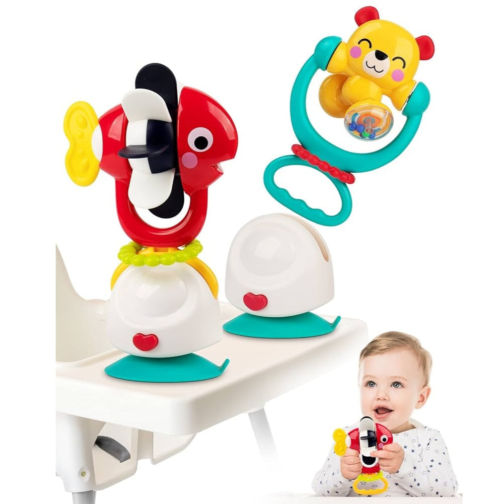 Los juguetes cuentan con una ventosa que permite sujetarlos a la mayoría de las superficies planas, incluidas sillas de bebé o mesas. >