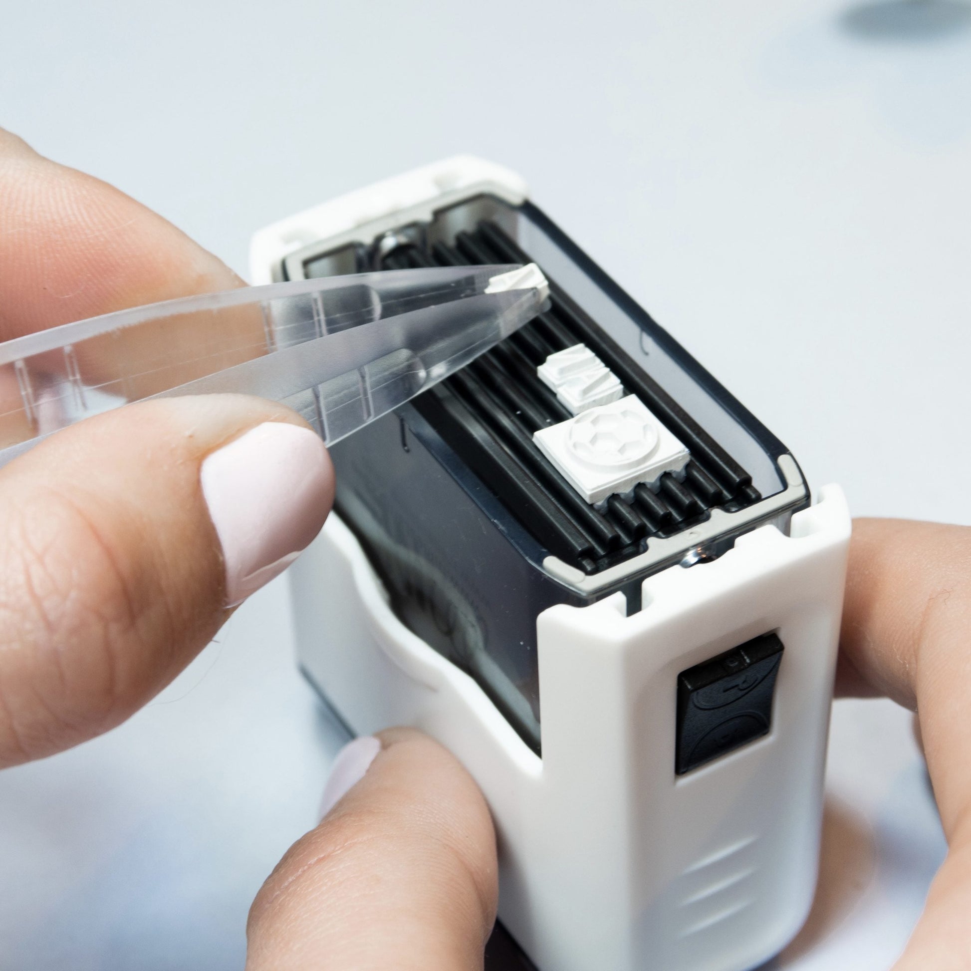 Con un solo click marcas directamente sobre la ropa o libros. Sin planchar y sin coser.