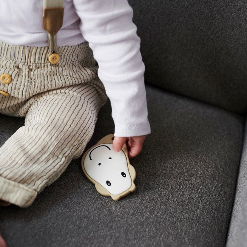 Fácil de sostener incluso para los bebés más pequeños, a los cuales les encantará masticar este mordedor de textura flexible día y noche.