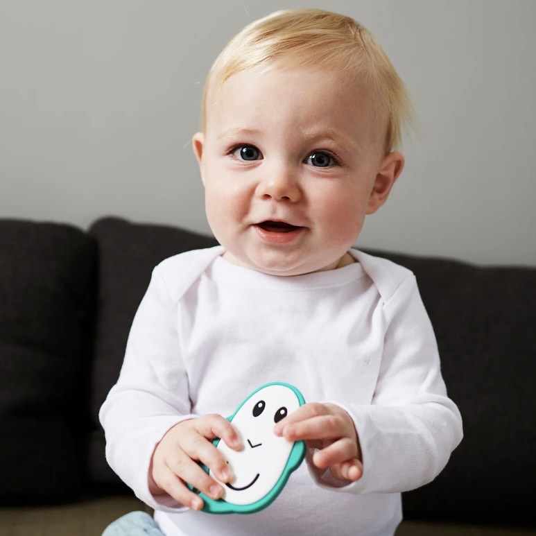 Fácil de sostener incluso para los bebés más pequeños, a los cuales les encantará masticar este mordedor de textura flexible día y noche.