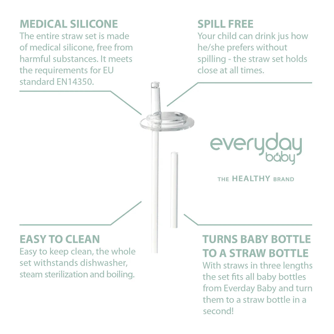 Amplía el uso de tus mamaderas: con bombillas en dos longitudes diferentes, el juego se adapta a todas nuestras botellas Healthy+ y amplía su usabilidad. Simplemente reemplaza la tetina de la mamadera con el juego de bombillas.>