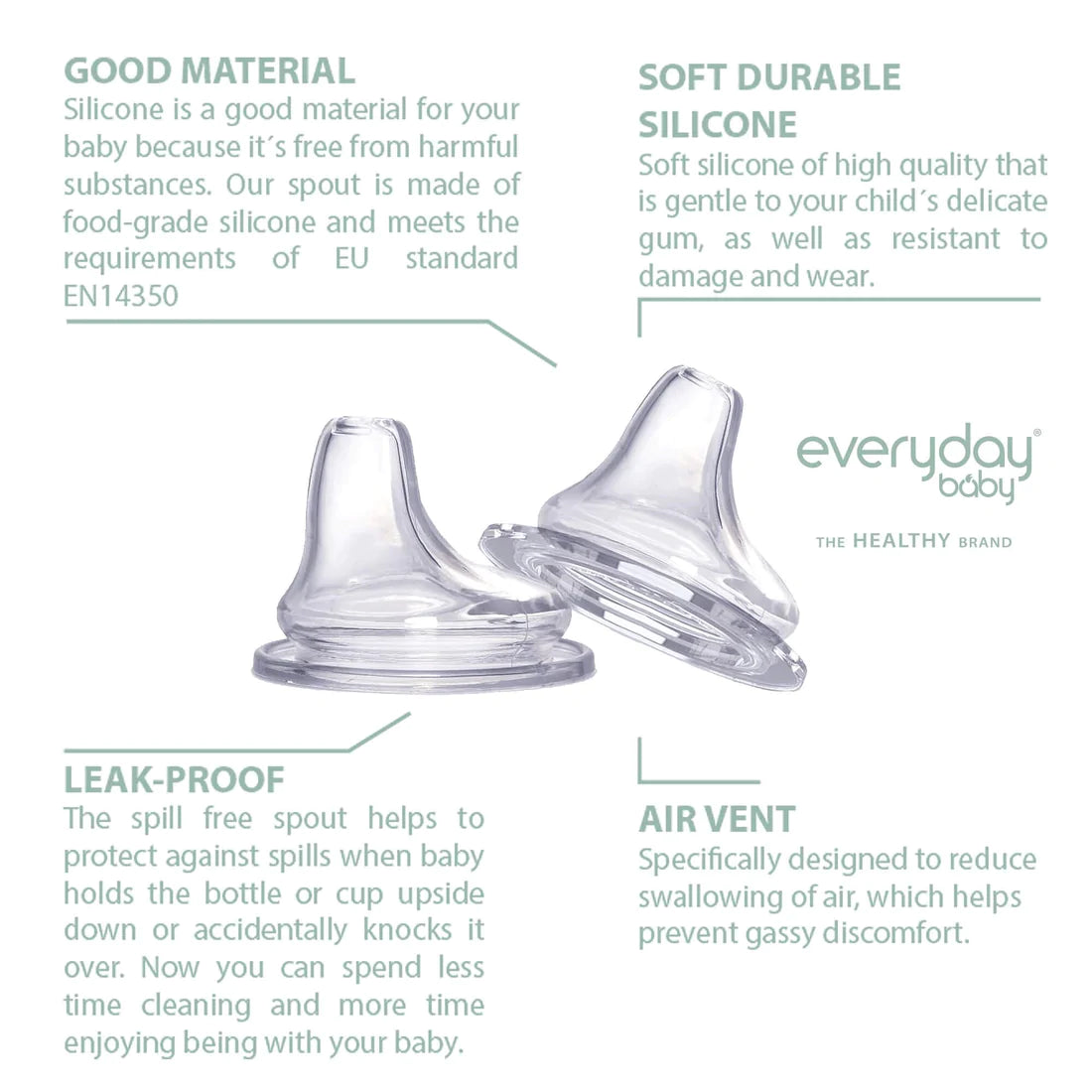 PVP referencial: $6,990El pack de 2 boquillas de silicona de Everyday Baby son cómodas y suaves para las encías de tu hijo.>
