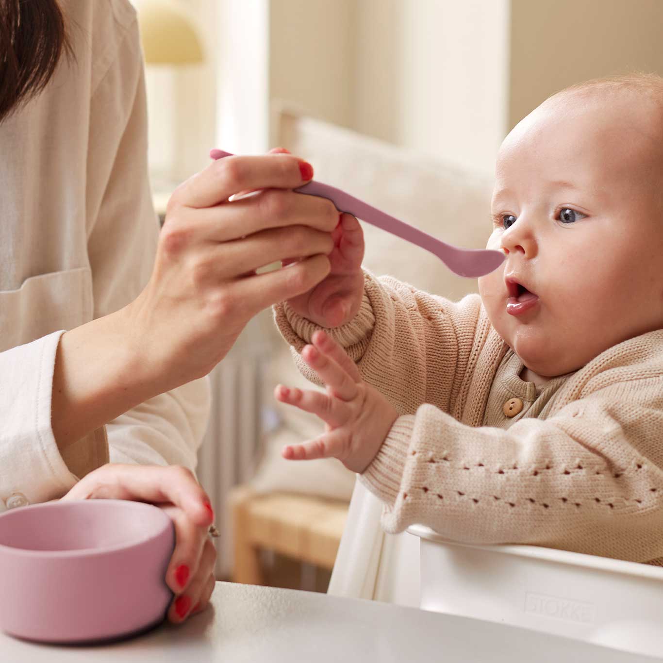 La suave superficie de silicona está especialmente diseñada para proteger la boca y las encías sensibles de tu bebé, al mismo tiempo que se mantiene estable gracias al núcleo de metal. Su diseño bien pensado proporciona un agarre firme mientras alimentas a tu hijo.