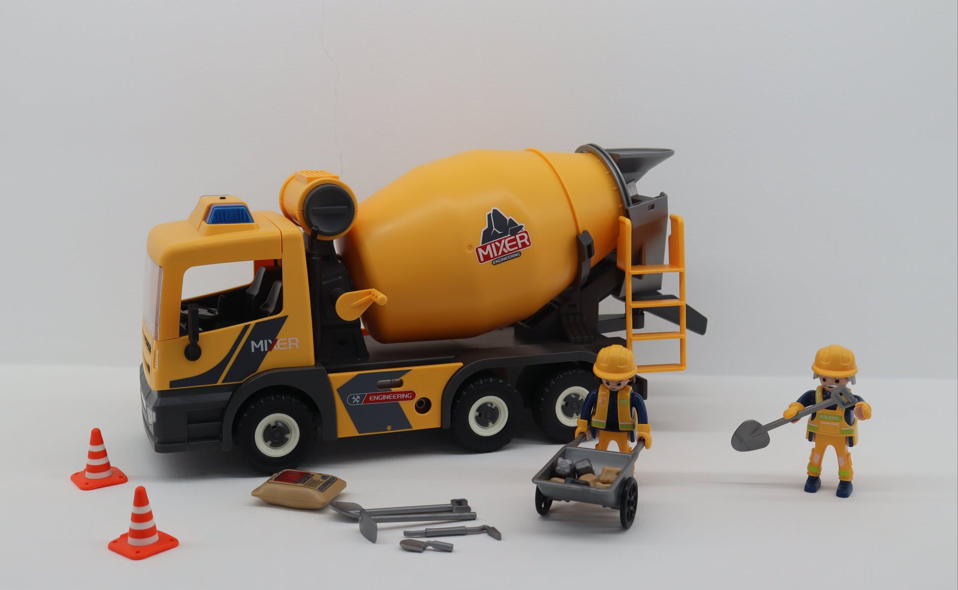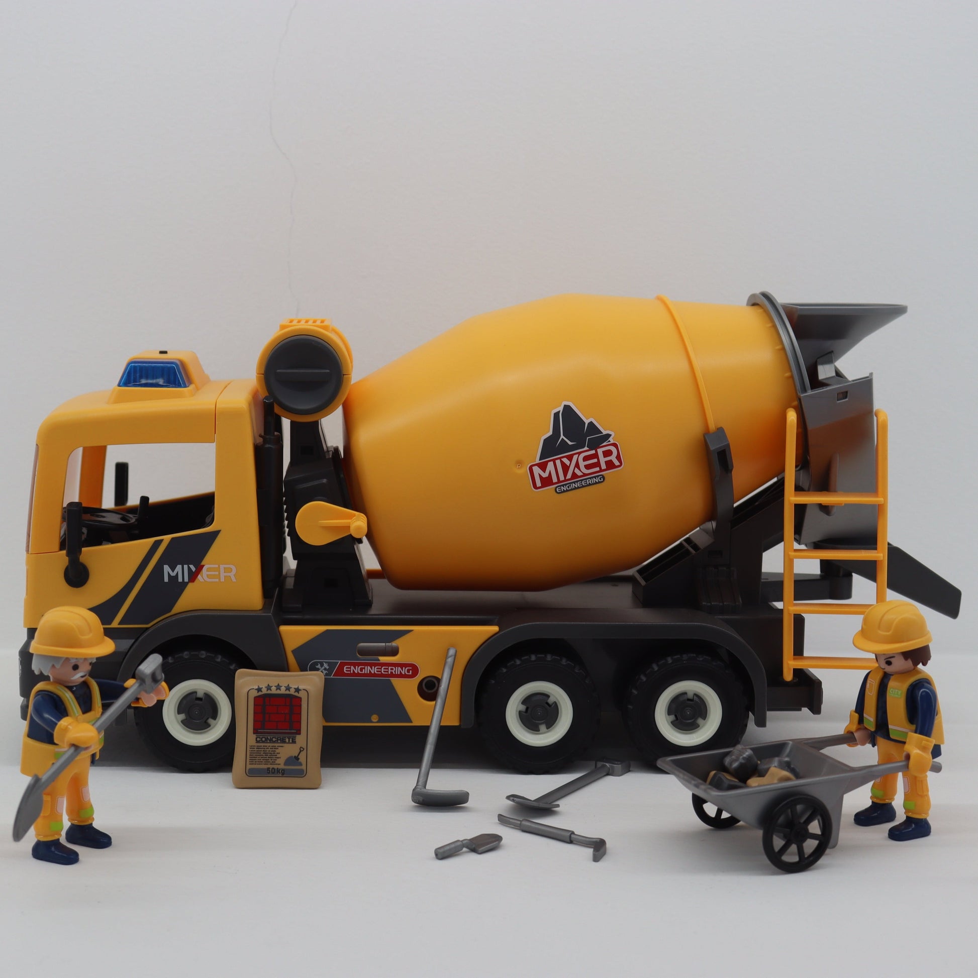 El set incluye un camión mezclador de cemento con luces y sonidos, una carretilla, herramientas, piedras de obra y una figura de obrero, ofreciendo todo lo necesario para vivir una experiencia de construcción completa y realista.